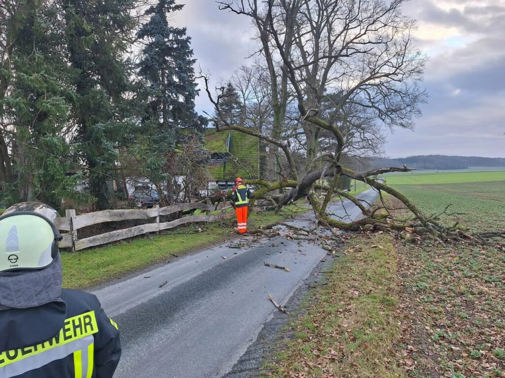 Beim Eintreffen an der Einsatzstelle entfernten wir zunächst die Baumkrone, die die Fahrbahn vollständig versperrte. Anschließend wurde der etwa 1,20 m starke Baumstamm so weit zurückgeschnitten, dass die Straße wieder sicher passierbar war.